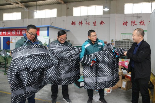 “這擋風(fēng)被真厚實(shí)?!?1月17日,河南省衛(wèi)輝市郵政分公司“三合一”郵件處理場地的投遞員們拿著新發(fā)放的棉帽子、棉手套、電動(dòng)車擋風(fēng)被等御寒保暖勞保用品感慨道?!鮿⑵G玲 攝