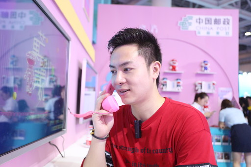 粉藍相間的主體配色、浪漫的彩色燈飾少女心十足,4臺聲音明信片錄制設備科技感滿滿......中國郵政的展區(qū)就在主舞臺的旁邊?!?0后”女孩沈佳珎剛剛在這里制作完一張聲音明信片,便急不可待地向朋友們展示她的“成果”?!皼]想到明信片也有這么新穎的傳遞方式?!彼龗呙杳餍牌系亩S碼,嘗試著回放自己剛剛錄制的聲音。聲音明信片錄制設備,可以將心里話錄制下來,生成二維碼,即時打印在明信片上。為了體驗制作聲音明信片,大家排起了長隊,成為展場的一道風景線。