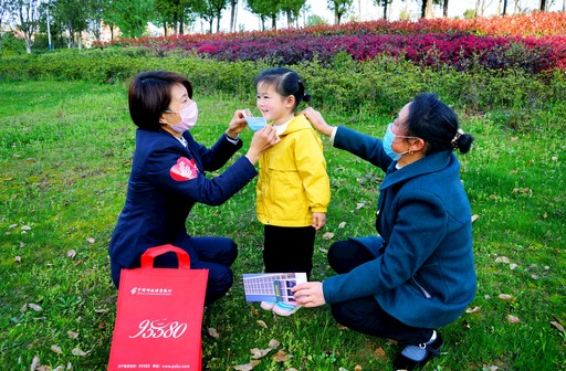 3月20日,郵儲銀行安徽省金寨縣支行在“郵愛公益日”設立三周年之際,開展宣傳活動。在疫情防控期間,該支行創(chuàng)新舉措,讓宣傳活動、疫情防控及文明創(chuàng)建相結合,將企業(yè)品牌宣傳與踐行社會責任深度融合。圖為該支行宣傳人員在公園執(zhí)勤點向居民介紹“郵愛公益”時,為小朋友戴上防護口罩。 □李明 攝影報道