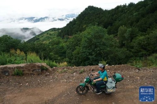 在山西省壺關縣大峽谷鎮(zhèn),趙月芳騎行在送件的路上(7月13日攝)。新華社記者 詹彥 攝