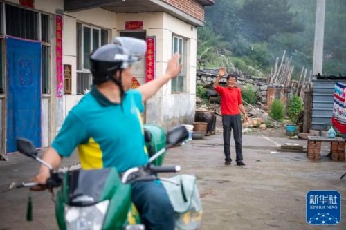 在山西省壺關縣大峽谷鎮(zhèn)壺陵水村,送件結束的趙月芳與村民揮手道別(7月13日攝)。新華社記者 楊晨光 攝