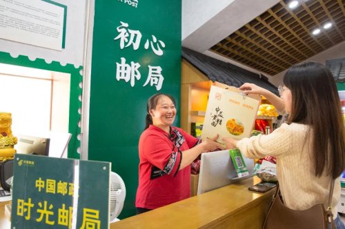 石柱縣分公司文化傳媒中心負責人向志華介紹,初心郵局在布置方面融入了黨建、石柱、本土文化、農(nóng)特產(chǎn)品等眾多元素,兩層樓構(gòu)造,一層展示當?shù)氐霓r(nóng)特產(chǎn)品,比如中益土蜂蜜、鹽竹筍、紅辣椒等;二層通過紀念郵票區(qū)、家書初心區(qū)、文創(chuàng)產(chǎn)品區(qū),提供特色郵政服務(wù)?!爸黝}郵局取名初心郵局,一方面是契合當?shù)爻跣男≡?、初心廣場的主題,另一方面也是展示‘人民郵政為人民’的初心?!?/p>
